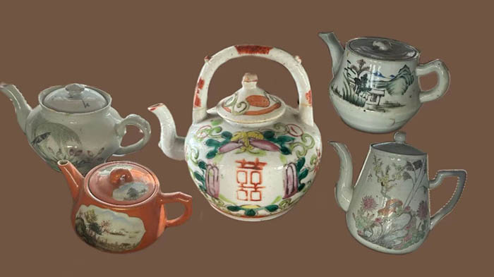 家中藏壺以民清瓷壺為最,大小形制各異:大者尺余,昔年用于泡制涼茶;小者盈握,當屬文人雅士案頭清供。壺身繪事尤為精妙,或山水空蒙,或福祿壽喜,或英雄豪杰,一筆一畫間,盡是匠人心思,更見歲月留痕。